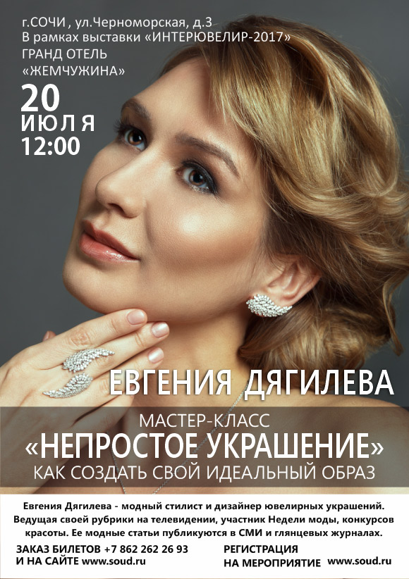 20 июля модный стилист, дизайнер ювелирных украшений, телеведущая Евгения Дягилева посетит город Сочи и проведёт в рамках выставки «ИнтерЮвелир-2017» мастер-класс «Непростое украшение».
